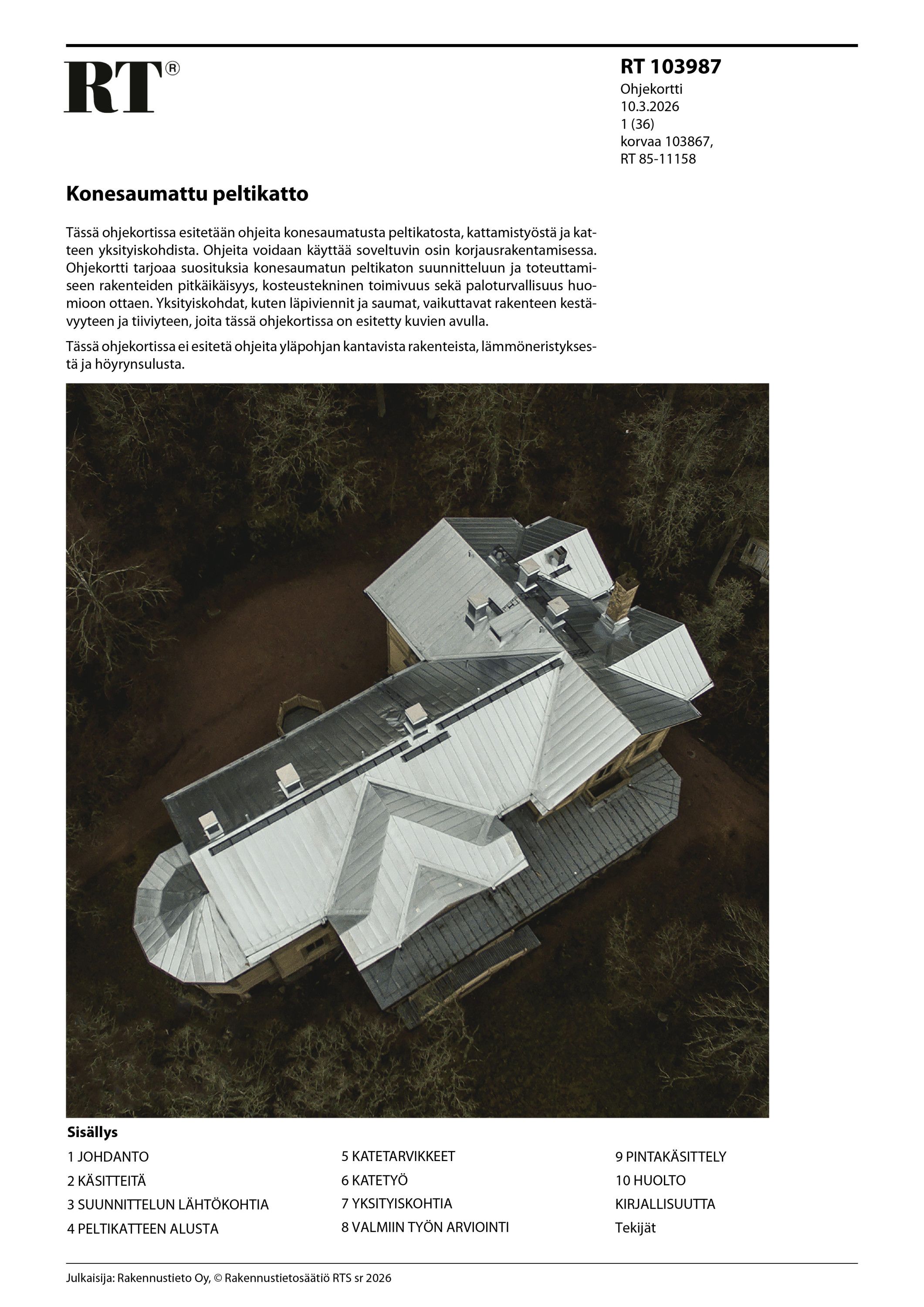 Tässä ohjekortissa esitetään ohjeita konesaumatusta peltikatosta, kattamistyöstä ja katteen yksityiskohdista. Ohjeita voidaan käyttää soveltuvin osin korjausrakentamisessa. Ohjekortti tarjoaa suosituksia konesaumatun peltikaton suunnitteluun ja toteuttamiseen rakenteiden pitkäikäisyys, kosteustekninen toimivuus sekä paloturvallisuus huomioon ottaen. Yksityiskohdat, kuten läpiviennit ja saumat, vaikuttavat rakenteen kestävyyteen ja tiiviyteen, joita tässä ohjekortissa on esitetty kuvien avulla.