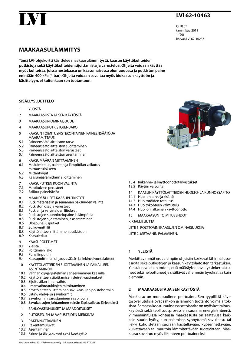 Tämä LVI-ohjekortti käsittelee maakaasulämmitystä, kaasun käyttökohteiden putkistoja sekä käyttökohteiden sijoittamista ja varustelua. Ohjeita voidaan käyttää myös kohteissa, joissa nestekaasu on kaasumaisessa olomuodossa ja putkiston paine enintään 400 kPa (4 bar). Ohjeita voidaan soveltaamyös biokaasun käyttöön ja käsittelyyn, ei kuitenkaan sen tuotantoon.