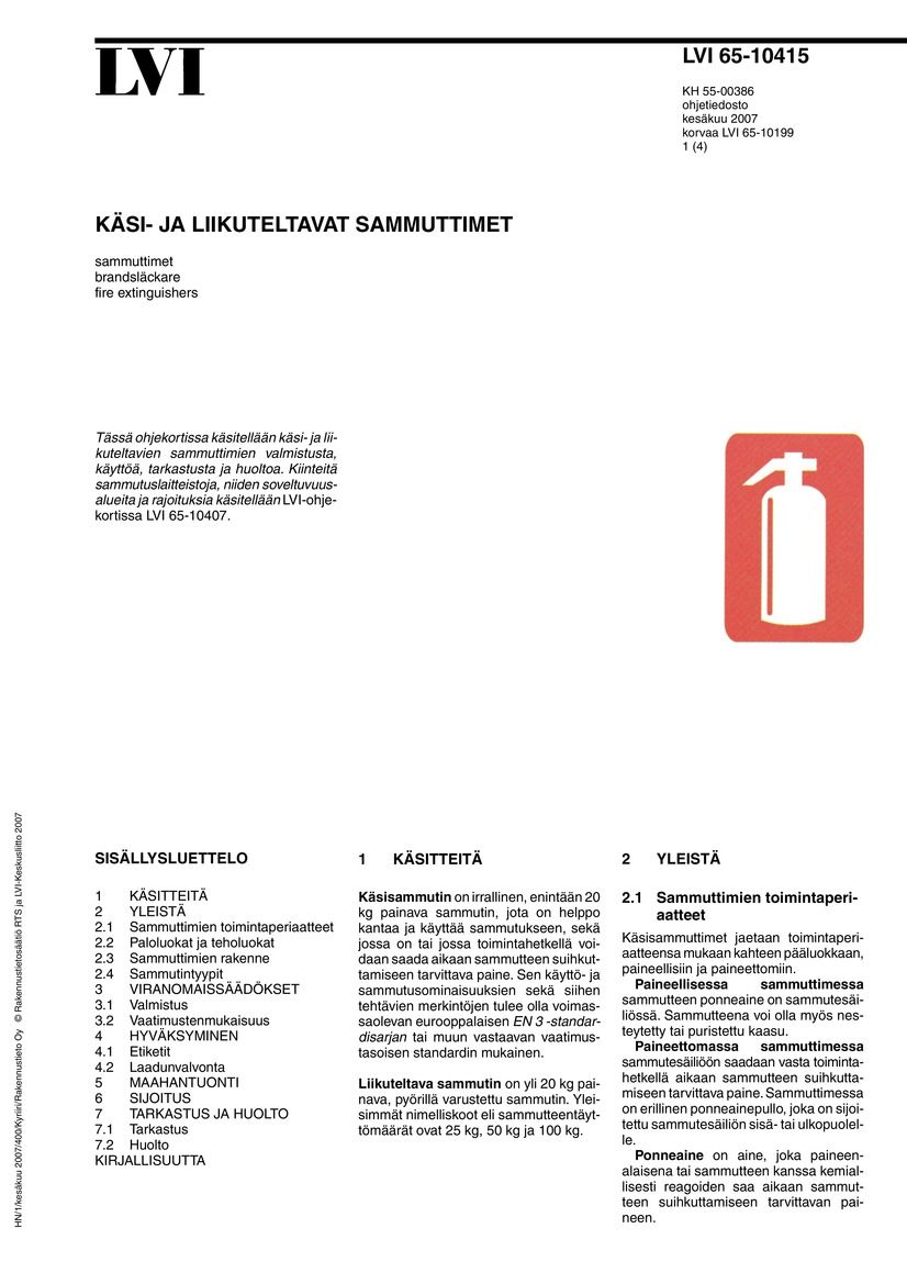 Tämä ohjekortti ilmestyy myös KH-kortistossa numerolla KH 55-00386. Tässä ohjekortissa käsitellään käsi- ja liikuteltavien sammuttimien valmistusta, käyttöä, tarkastusta ja huoltoa. Kiinteitä sammutuslaitteistoja, niiden soveltuvuusalueita ja rajoituksia käsitellään LVI-ohjekortissa LVI 65-10407.