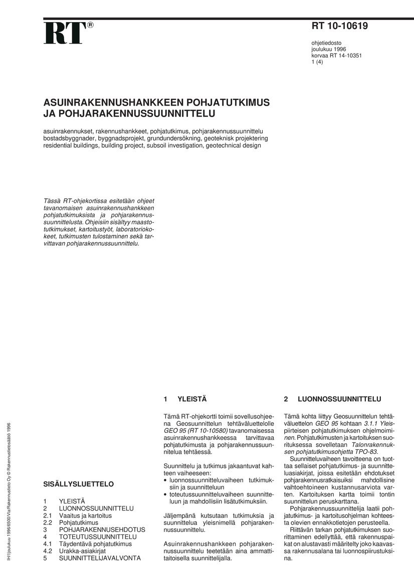 RT-ohjeessa esitetään ohjeet tavanomaisen asuinrakennushankkeen pohjatutkimuksista ja pohjarakennussuunnittelusta. Ohjeisiin sisältyy maastotutkimukset, kartoitustyöt, laboratoriokokeet, tutkimusten tulostaminen sekä tarvittavan pohjarakennussuunnittelun.