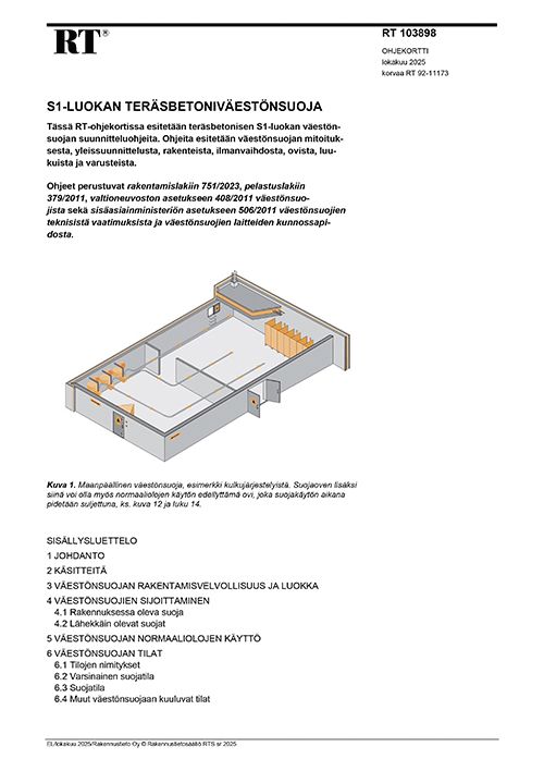 Tässä RT-ohjekortissa esitetään teräsbetonisen S1-luokan väestönsuo-jan suunnitteluohjeita. Ohjeita esitetään väestönsuojan mitoituksesta, yleissuunnittelusta, rakenteista, ilmanvaihdosta, ovista, luukuista ja varusteista.