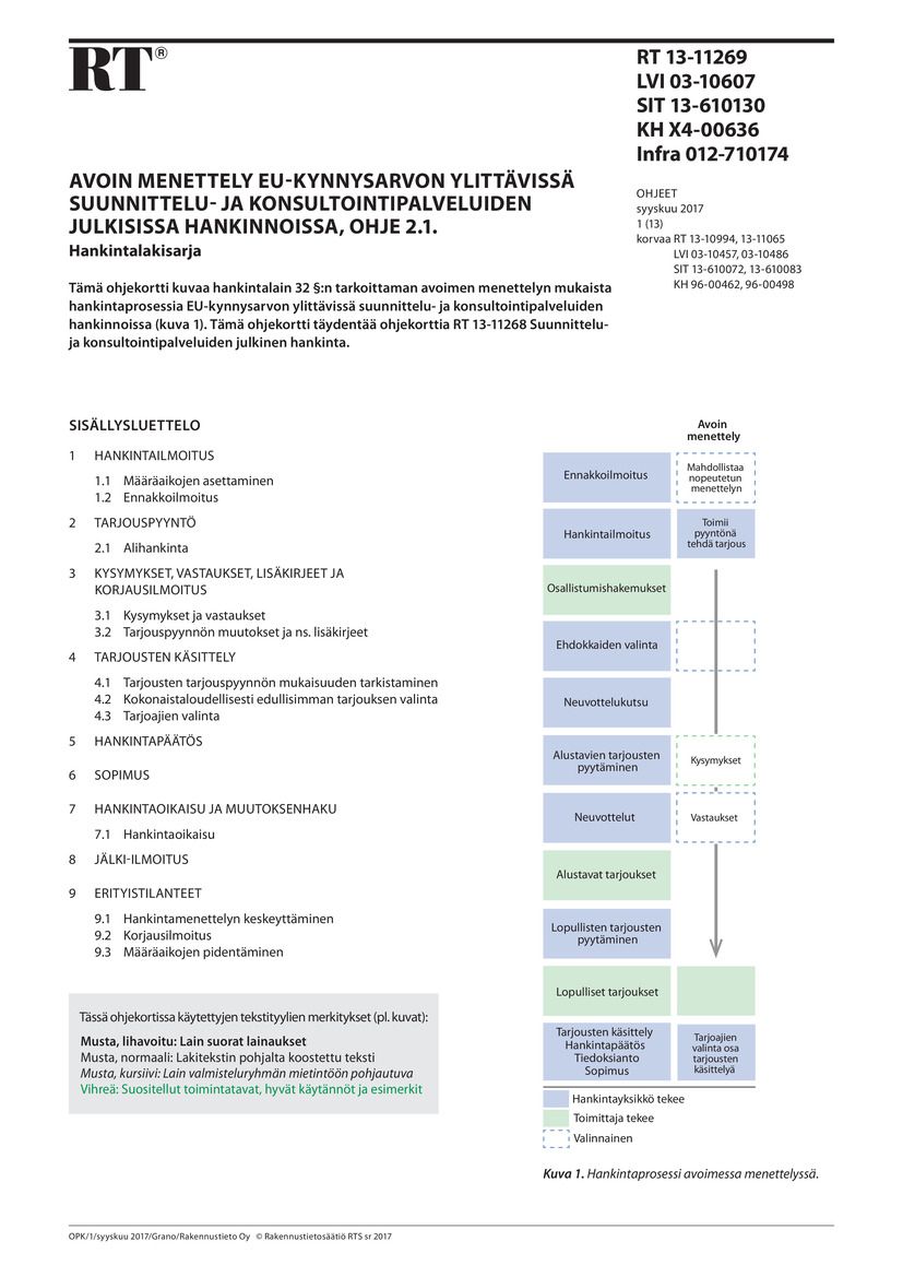 | Nimeke: | RT 13-11269, Avoin menettely EU-kynnysarvon ylittävissä suunnittelu- ja konsultointipalveluiden julkisissa hankinnoissa, ohje 2.1. Hankintalakisarja | ||