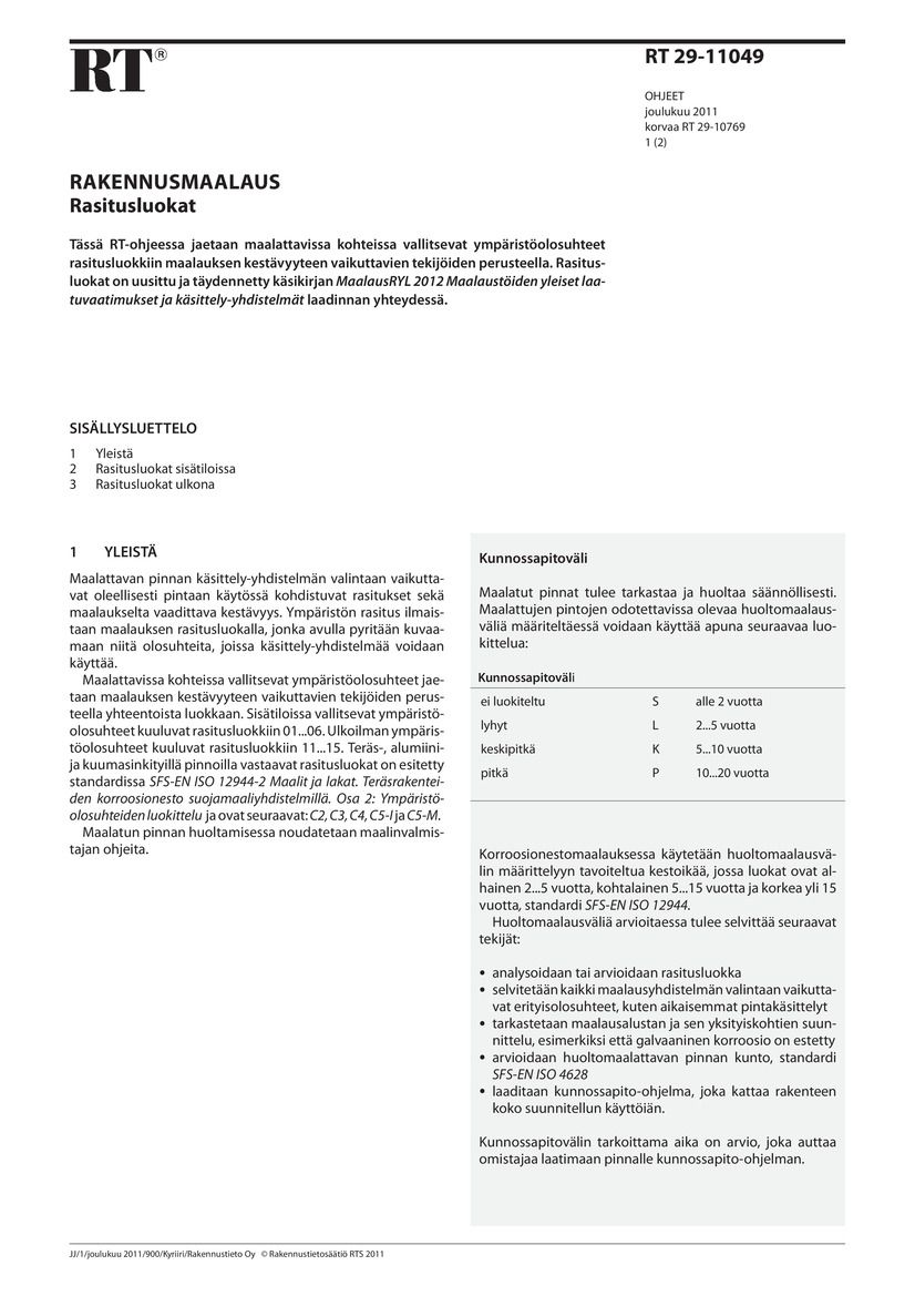 Tässä RT-ohjeessa jaetaan maalattavissa kohteissa vallitsevat ympäristöolosuhteet rasitusluokkiin maalauksen kestävyyteen vaikuttavien tekijöiden perusteella. Rasitusluokat on uusittu ja täydennetty käsikirjan MaalausRYL 20012 Maalaustöiden yleiset laatuvaatimukset ja käsittely-yhdistelmät laadinnan yhteydessä.