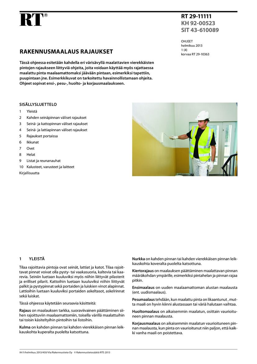 RT-ohjeessa esitetään kahdella eri värisävyllä maalattavien vierekkäisten pintojen rajaukseen liittyviä ohjeita, joita voidaan käyttää myös rajattaessa maalattu pinta maalaamattomaksi jäävään pintaan, esimerkiksi tapettiin, puupintaan jne. Esimerkkikuvat on tarkoitettu havainnollistamaan ohjeita. Ohjeet sopivat ensi-, pesu-, huolto- ja korjausmaalaukseen.