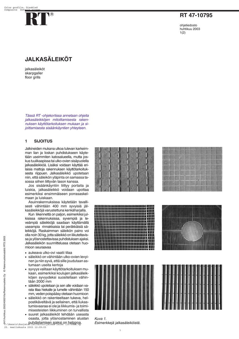 RT-ohjeita jalkasäleikköjen mitoittamisesta rakennuksen käyttötarkoituksen mukaan ja sijoittamisesta sisäänkäyntien yhteyteen.