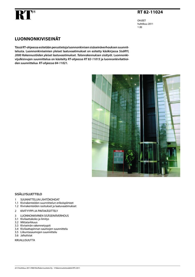 Tässä ohjeessa esitetään perustietoja luonnonkivisen sisäseinäverhouksen suunnittelusta. Luonnonkiviseinien yleiset laatuvaatimukset on esitetty käsikirjassa SisäRYL 2000 Rakennustöiden yleiset laatuvaatimukset. Talonrakennuksen sisätyöt. Luonnonkivijulkisivujen suunnittelua on käsitelty RT-ohjeessa RT 82-11015 ja luonnonkivilattioiden suunnittelua RT-ohjeessa 84-11021.