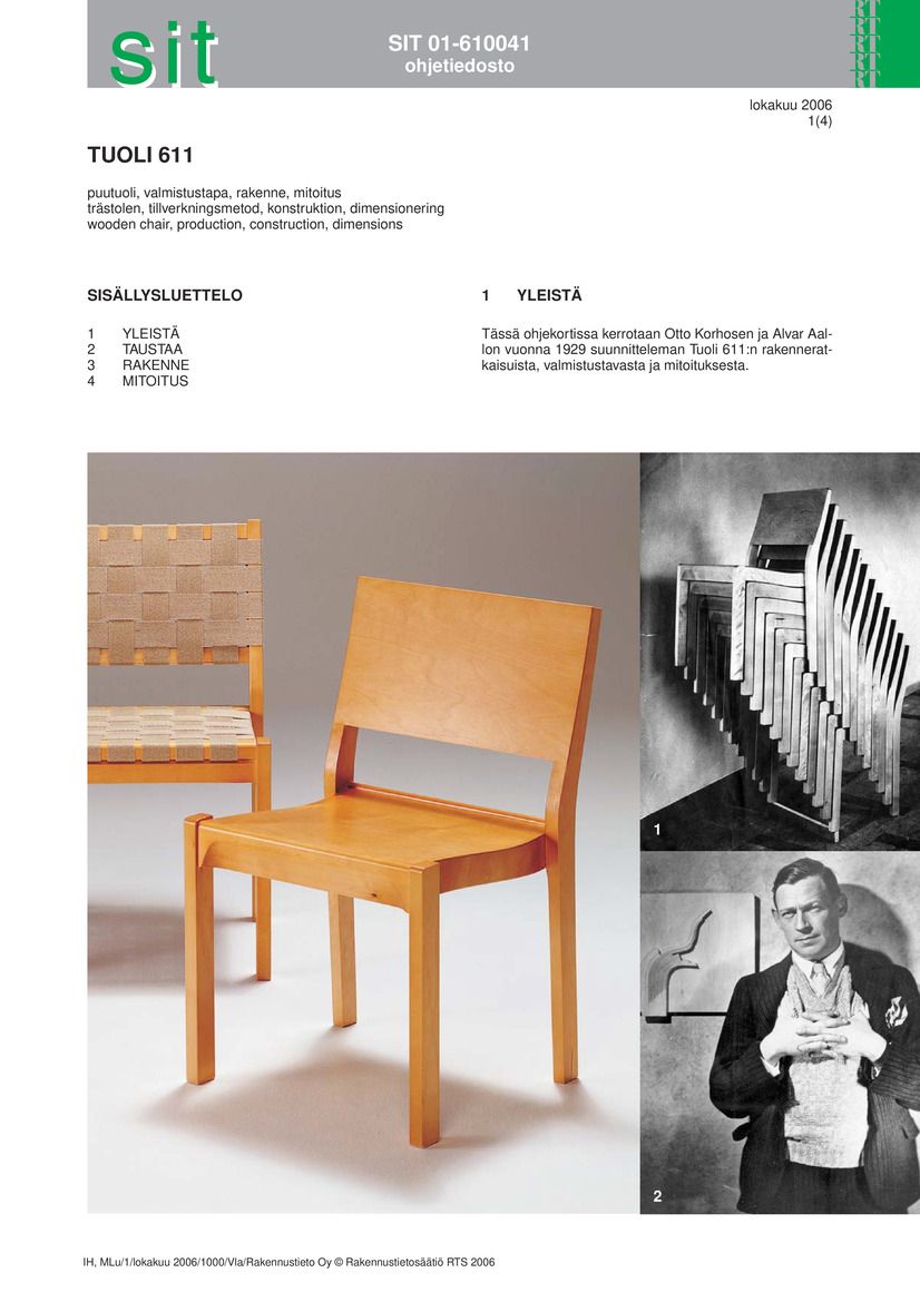 Tässä ohjeessa kerrotaan Otto Korhosen ja Alvar Aallon vuonna 1929 suunnitteleman Tuoli 611:n rakenneratkaisuista, valmistustavasta ja mitoituksesta.