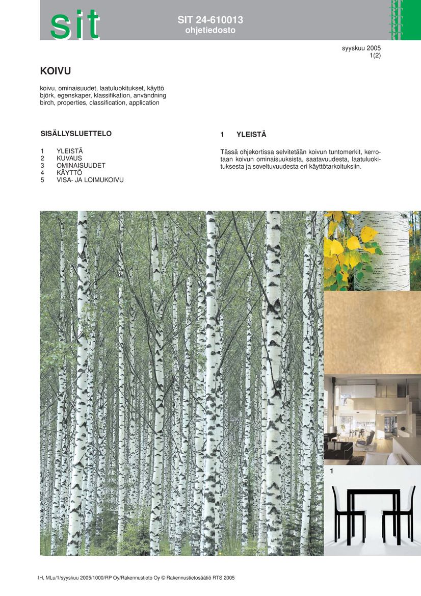 Tässä ohjeessa selvitetään koivun tuntomerkit, kerrotaan koivun ominaisuuksista, saatavuudesta, laatuluokituksesta ja soveltuvuudesta eri käyttötarkoituksiin.