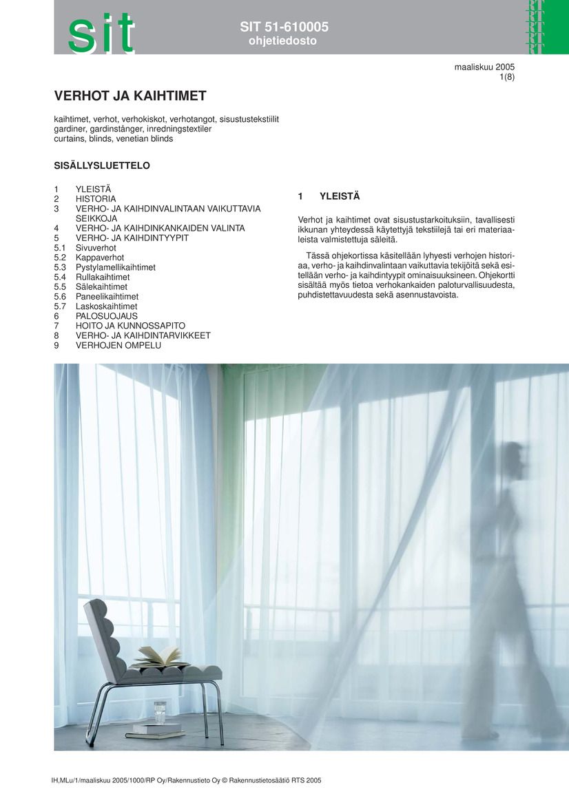 1. YLEISTÄ, 2. HISTORIA, 3. VERHO- JA KAIHDINVALINTAAN VAIKUTTAVIA SEIKKOJA, 4. VERHO- JA KAIHDINKANKAIDEN VALINTA, 5. VERHO- JA KAIHDINTYYPIT, 5.1 Sivuverhot, 5.2 Kappaverhot, 5.3 Pystylamellikaihtimet, 5.4 Rullakaihtimet, 5.5 Sälekaihtimet, 5.6 Paneelikaihtimet, 5.7 Laskoskaihtimet, 6. PALOSUOJAUS, 7. HOITO JA KUNNOSSAPITO, 8. VERHO- JA KAIHDINTARVIKKEET, 9. VERHOJEN OMPELU.