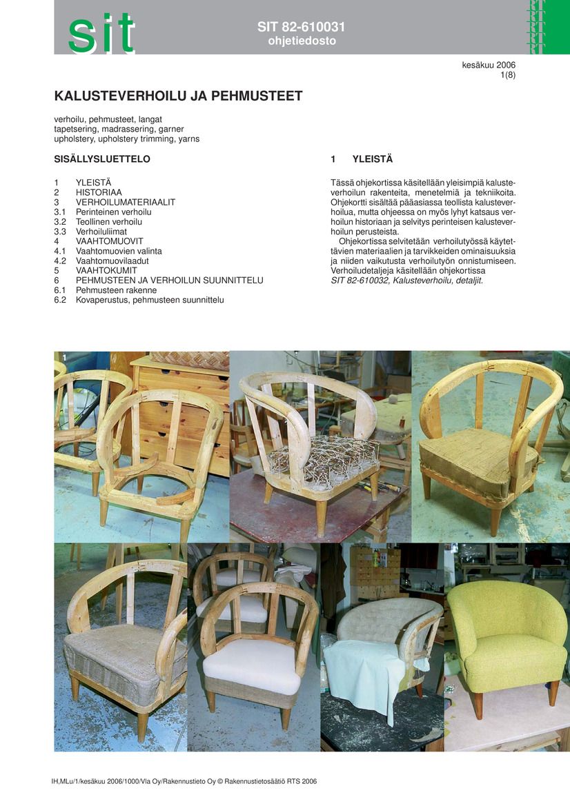 Ohjeessa selvitetään verhoilutyössä käytettävien materiaalien ja tarvikkeiden ominaisuuksia ja niiden vaikutusta verhoilutyön onnistumiseen. Verhoiludetaljeja käsitellään SIT-ohjeessa SIT 82-610032, Kalusteverhoilu, detaljit.